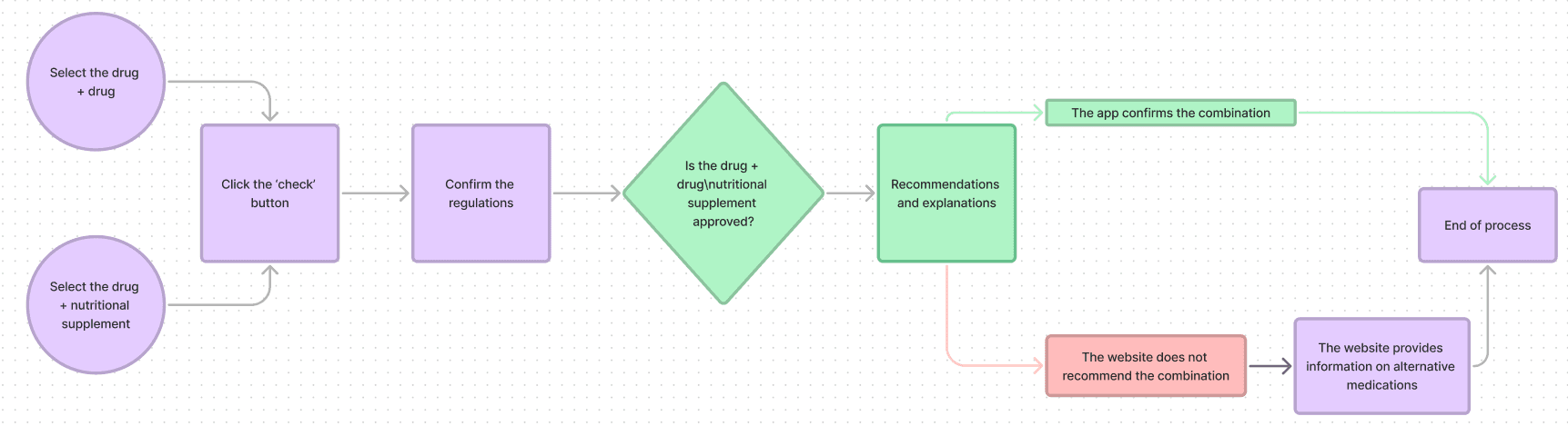 If the combination is not approved: The app provides information on alternative medications, offers a purchase option, and redirects to a relevant website > End of process.